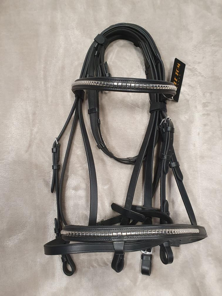 Ez a fémdíszes bőr kantár klasszikus angol stílusban készült, mely ötvözi az eleganciát és a praktikusságot.
