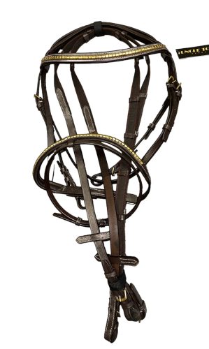Ez a fémdíszes bőr kantár klasszikus angol stílusban készült, mely ötvözi az eleganciát és a praktikusságot.A homlok- és orrszíjon elhelyezett fém díszítés különleges megjelenést kölcsönöz, míg a valódi bőr anyag hosszú élettartamot biztosít.