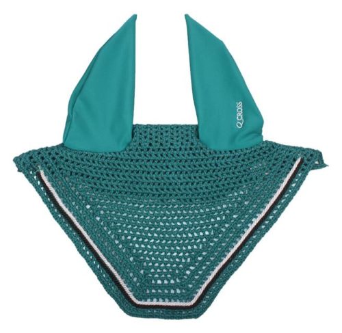 Crocheted earnet with elastane ears from the Q-Cross collection of QHP. This riding cap is decorated with two narrow decorative cords along the edge and a Q-cross embroidery on the left ear.