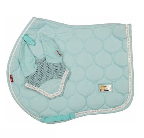 Saddle pad with ear pads in a luxurious look made of new JQ material. It is decorated with a double border with a glittering chain in the middle and a metallic Kentaur logo. The saddle pad is lined with CoolMax mesh, which allows quick drying and breathability. The anatomical shape ensures that the withers won't be pressed or irritated. Plus it's also more comfortable for the horse in the girth area.