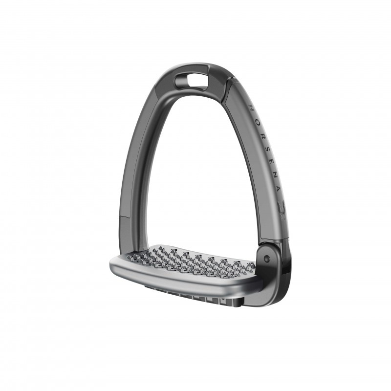 This stirrup will no longer leave your foot, except in case of a fall!- Rider safety: Lateral arm made of polyurethane with a 90° opening designed to release the foot in the event of a fall.- Optimal grip: Sole features holes combined with a 3D structure for excellent grip and quick dirt expulsion.- Ergonomics: Slightly angled eyelet for a natural leg position. Anatomical sole with a 5° incline to facilitate heel drop and ensure proper foot positioning in the stirrup.DETAILS:- Interchangeable branches and soles.- Steel supports up to 300 kg (per piece).- Sold in pairs.COMPOSITION: Stainless steel, PU.Care instructions: Wash with mild soapy water, rinse, and dry with a clean cloth.Made in Italy.
