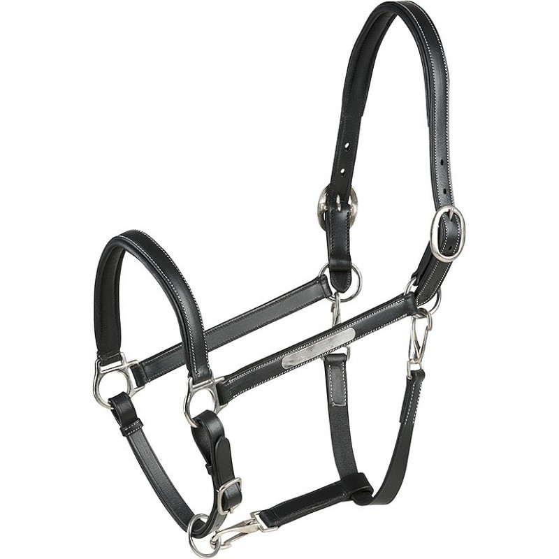 Buffalo leather headcollar with dual adjustment head piece and 26 mm wide adjustable noseband with buckles, and quick release snaps on throatlatch. Padded noseband and headpiece with tone on tone lining. Plate to engrave.