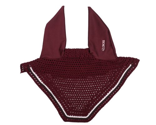 Crocheted earnet with elastane ears from the Q-Cross collection of QHP. This riding cap is decorated with two narrow decorative cords along the edge and a Q-cross embroidery on the left ear.