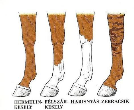 - Kesely: fehér szőrfolt, amely a pártától kezdődően a csűdön át egészen a térdig érhet